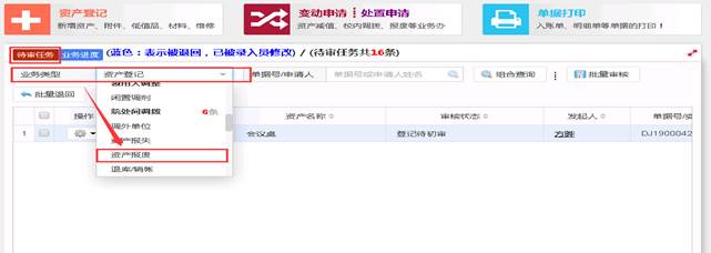 当老师提交完变动申请后,需要由管理员进行审核通过,管理员可通首页待审任务的下拉列表中选择固定资产变动的相关项目,即可查询出相关业务的数据进行终审。