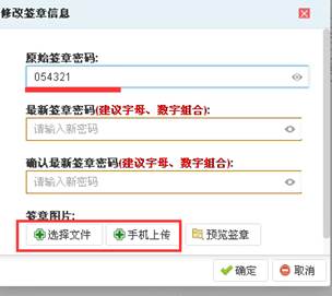 修改电子签章:原始密码是054321,签章图片可以直接点击[选择文件]从电脑中上传图片;也可以通过手机链接校内网络,点击手机上传扫描二维码,在手机签字上传到电脑端确认,电子签章要求笔画清晰。