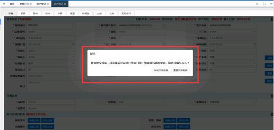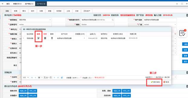 资产信息填写完成并确定保存后,会提示保存成功,且会弹出如图所示窗口;第一步可以对登记的信息进行修改,确认无误后点击第二步的‘提交审核’按钮,完成资产的录入。