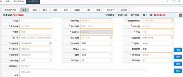 选择资产登记类型:固定资产、低值耐用品,再选择需要录入的资产卡片,资产卡片填写完整后,点击“保存”按钮。