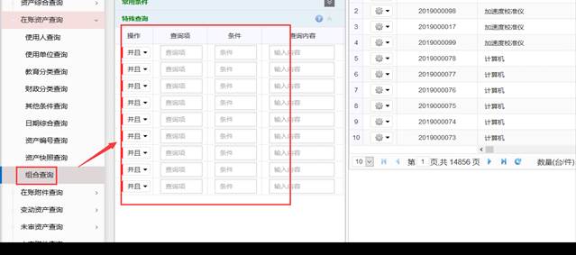 该功能可以任意组合查询资产条件,并可将查询结果导入到EXCEL中去制表打印结果,